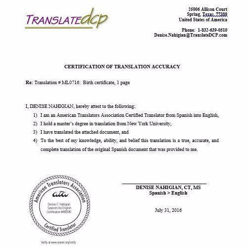 is simply a translated text accompanied by a signed (and frequently notarized) statement that the translator, to the best of his ability, has provided a true and accurate translation of the text from one language into another. It is an assurance to the client that the translator has done the work himself, rather than outsource it to a third party, and that the translated text is his best effort.